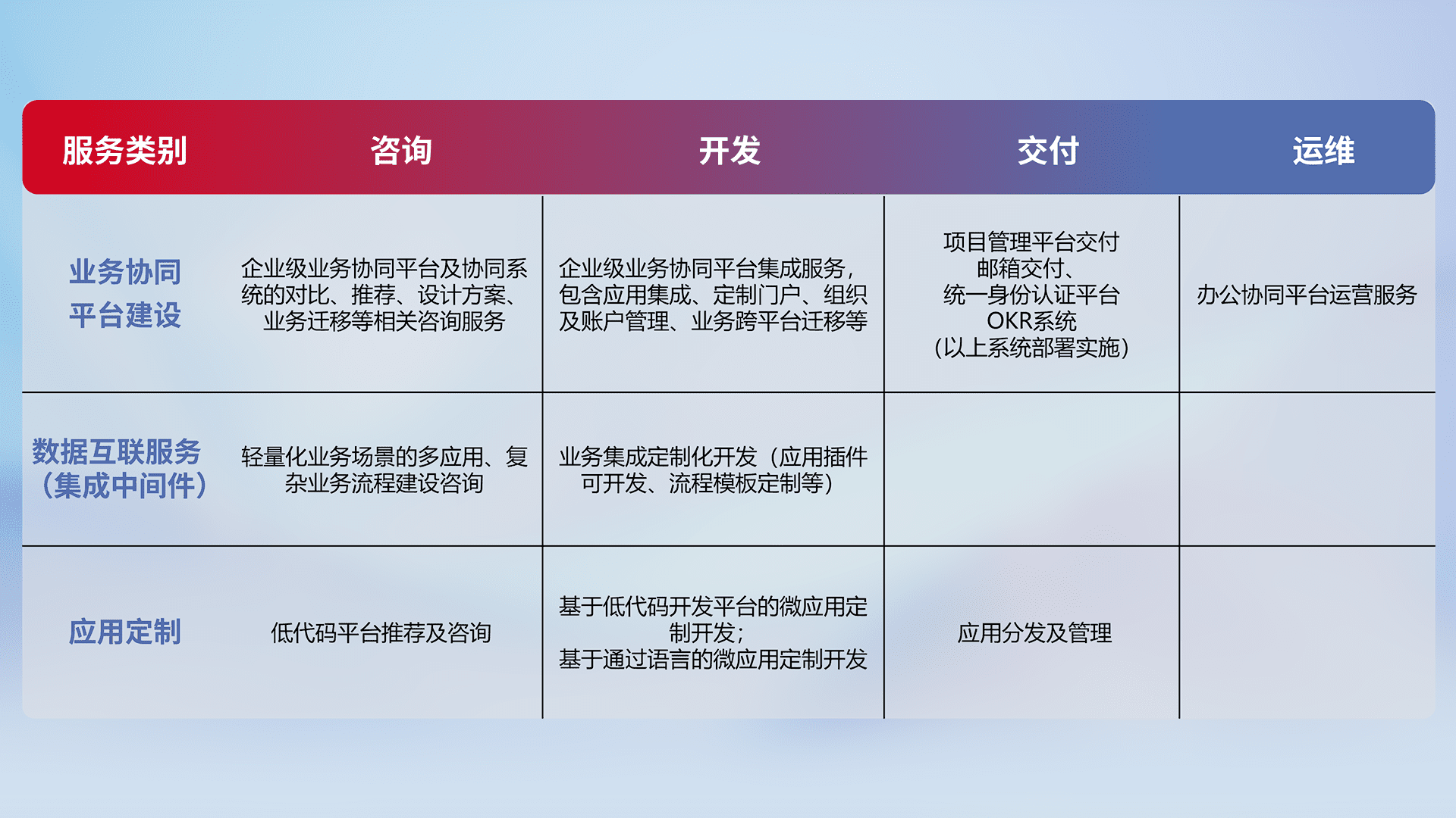 针对钉钉、、企微、、、、IDaas等平台级产品提供产品的规划、、、方案、、交付、、、、定制化开发等服务,,,,实现如统一协同办公、、、、智能客户服务、、混合会议管理、、智能数据查询、、、、等业务场景,,,实现数字化转型。。。。